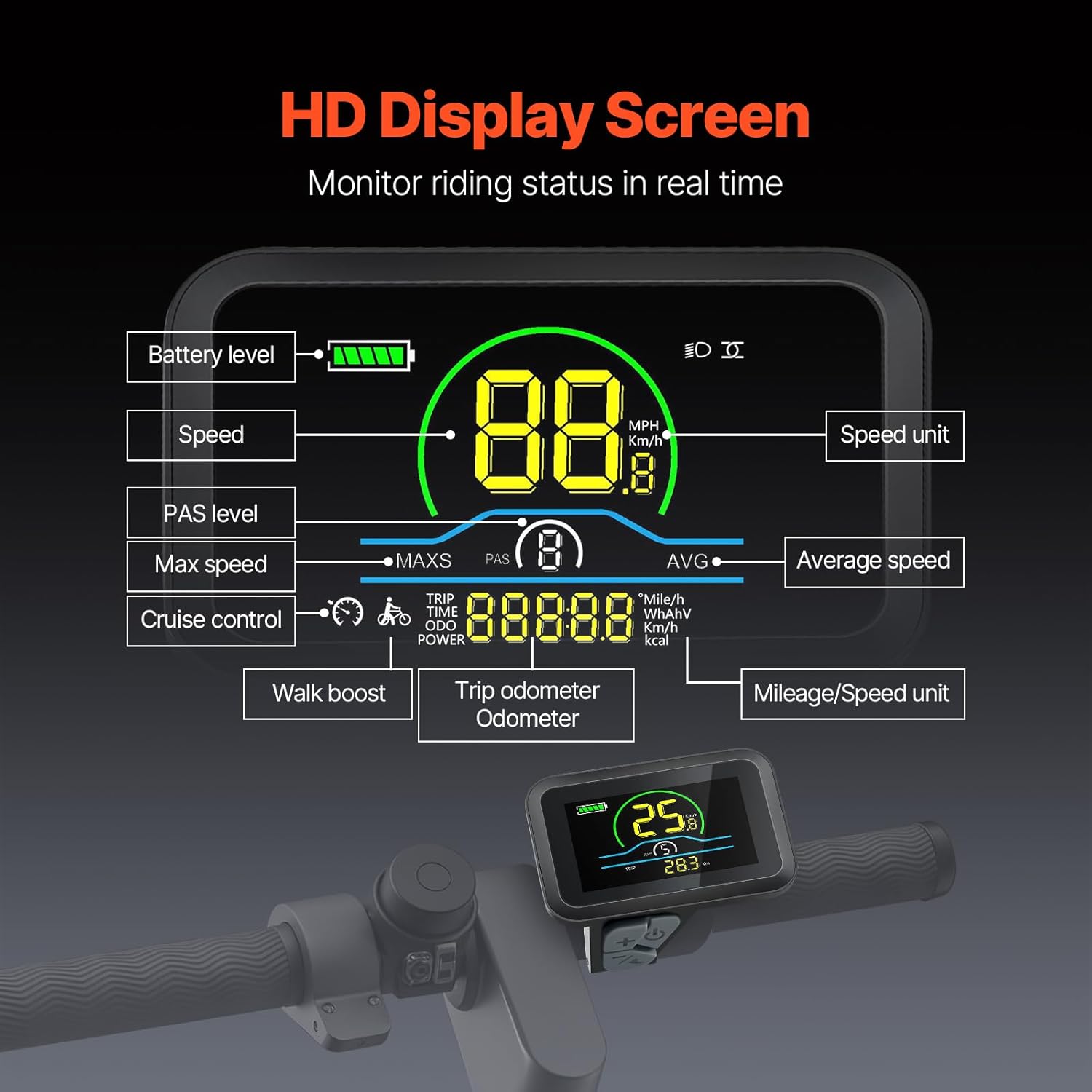Stay in control with the high-definition LCD screen, which provides real-time ride data including speed, distance, PAS level, and battery status. Keep track of your journey’s details for a safer and more informed riding experience.