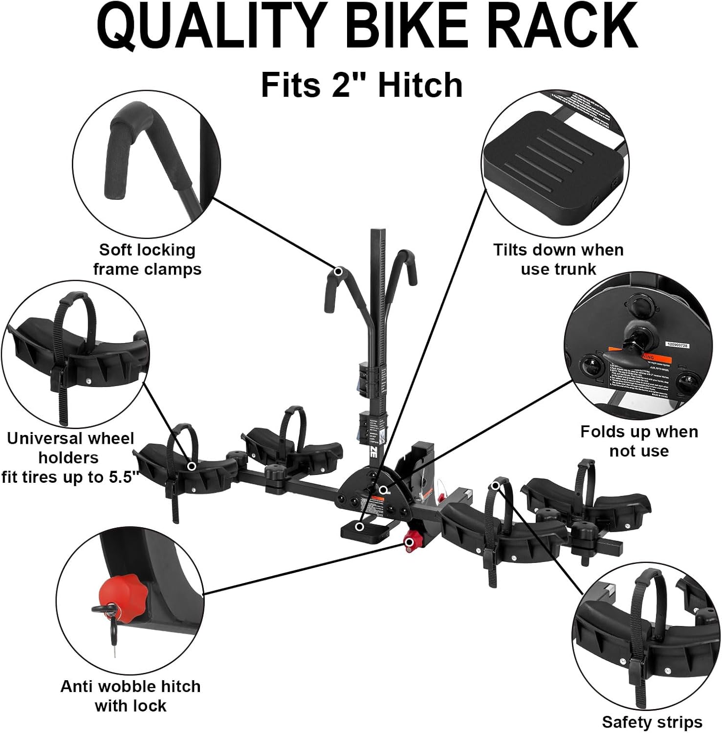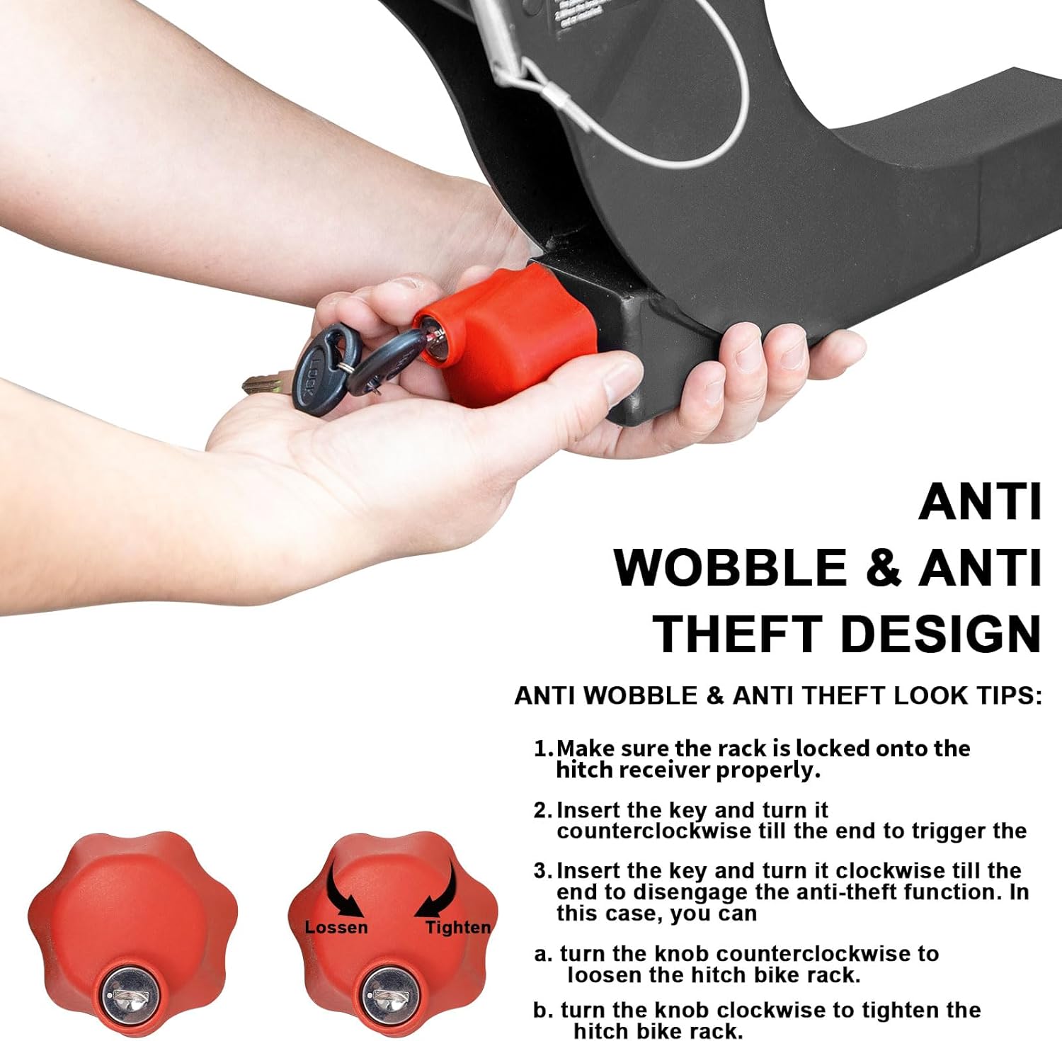 ✅ ANTI-WOBBLE & ANTI-THEFT DESIGN: Integrated key locking device secures rack tightly into 2-inch hitch receiver for wobble-free installation. Rack locks in place for enhanced security. (Note: For low step-through bikes, a top cross-bar must be purchased separately.)