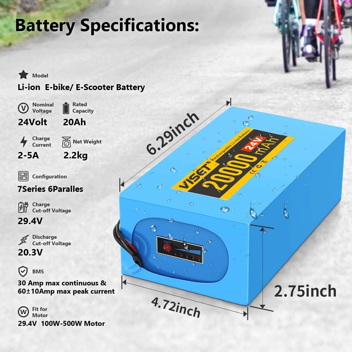 Dimensions: 5.69 in × 3.74 in × 2.76 in | Weight: 3.08 lb. Designed for 100–500W motors, this compact and lightweight 24V ebike battery features an upgraded power indicator light for clear and convenient status monitoring.