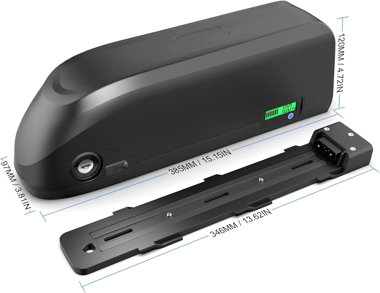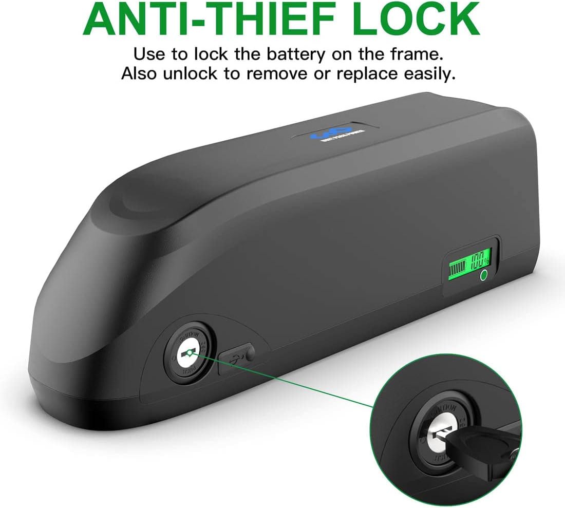 This electric bike battery comes with a mounting base designed to fit most bicycle frames. A keyed lock securely fastens the battery to the frame, helping prevent theft. The built-in LED power indicator clearly displays remaining battery level, reminding you to recharge in time. Each battery pack undergoes a complete charge and discharge test during production to ensure you receive the full capacity you paid for.