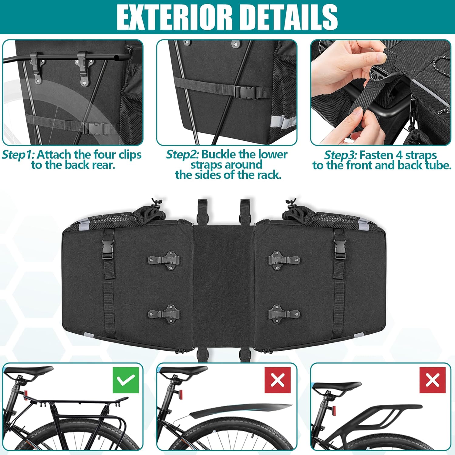 【Secure & Simple Mounting】 The underside includes quick‑attach clips and adjustable buckle straps that fit over most rear racks (up to 7” wide). Four additional straps keep the bag stable on rough roads. Built‑in stiff panels prevent sagging and contact with wheel spokes.