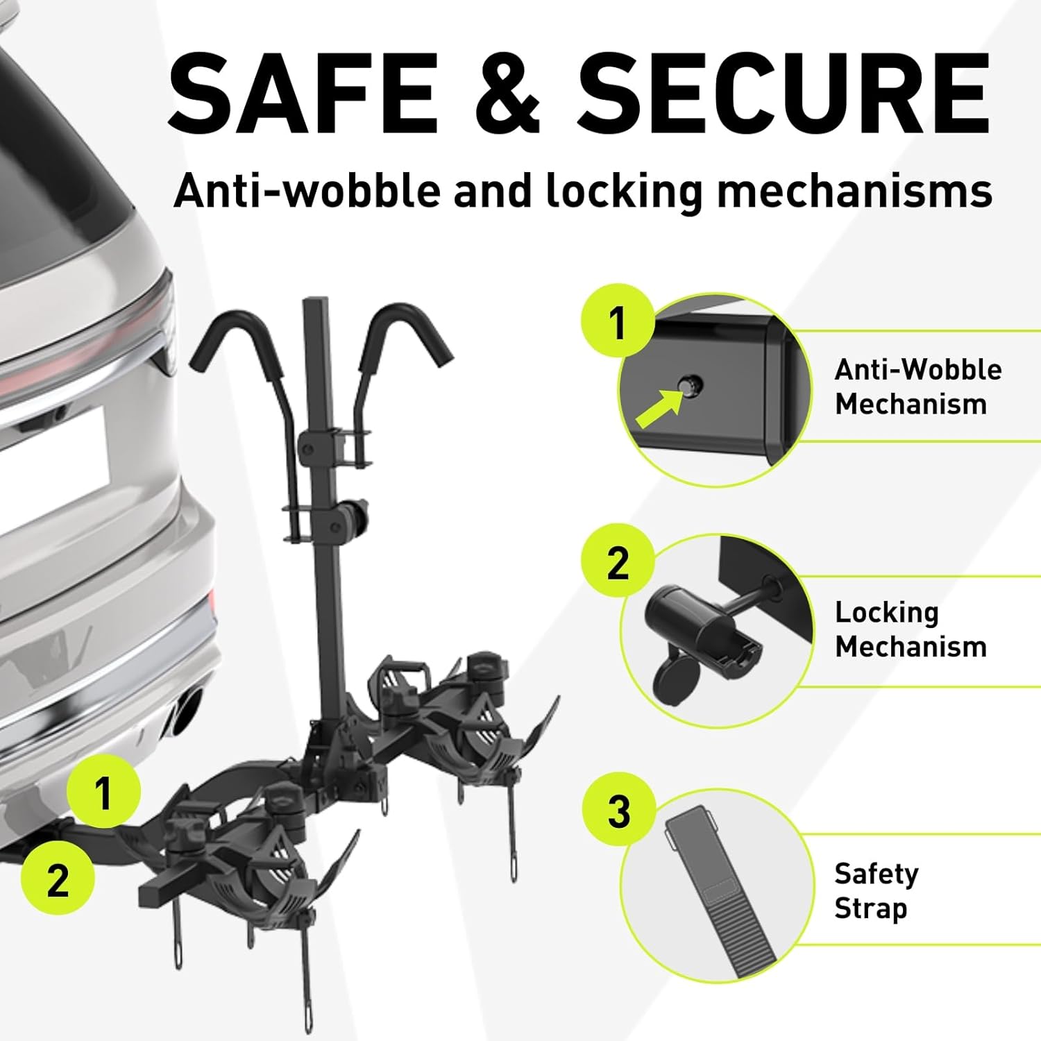LOCKING ANTI-WOBBLE HITCH – Integrated lock secures rack to 2-inch hitch receiver, eliminates sway and bounce. Enjoy a quiet, rattle-free ride.