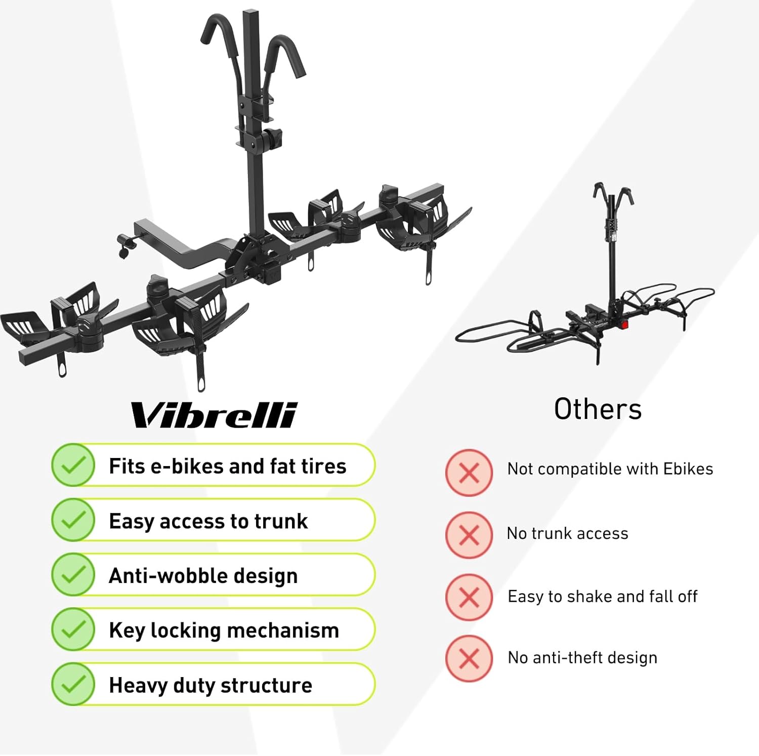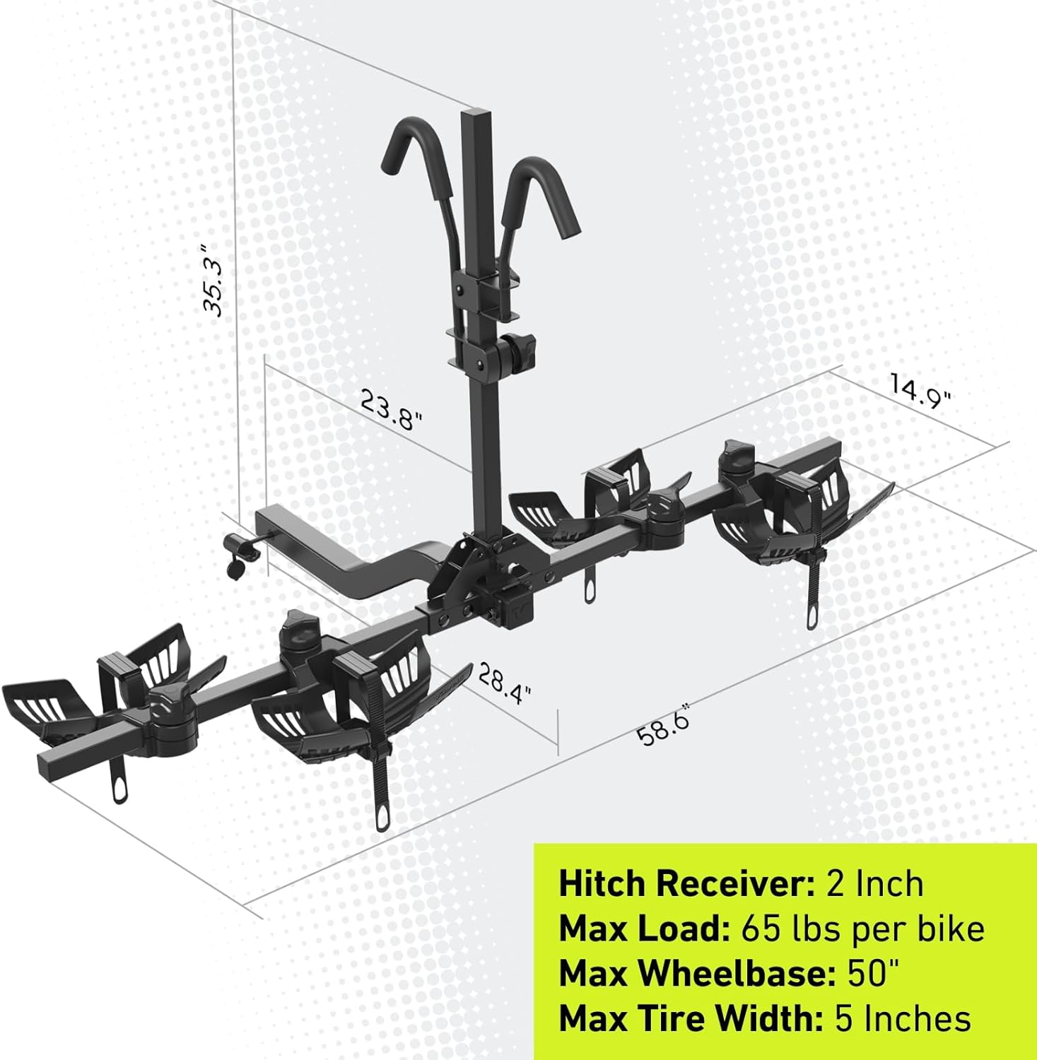 EBIKE COMPATIBLE – Supports two bikes up to 65 lbs each (130 lbs total capacity). V70 Hitch Rack accommodates road bikes, mountain bikes, MTB, and fat tire bikes up to 5 inches wide. Designed for SUVs and cars with a 2-inch hitch receiver.
