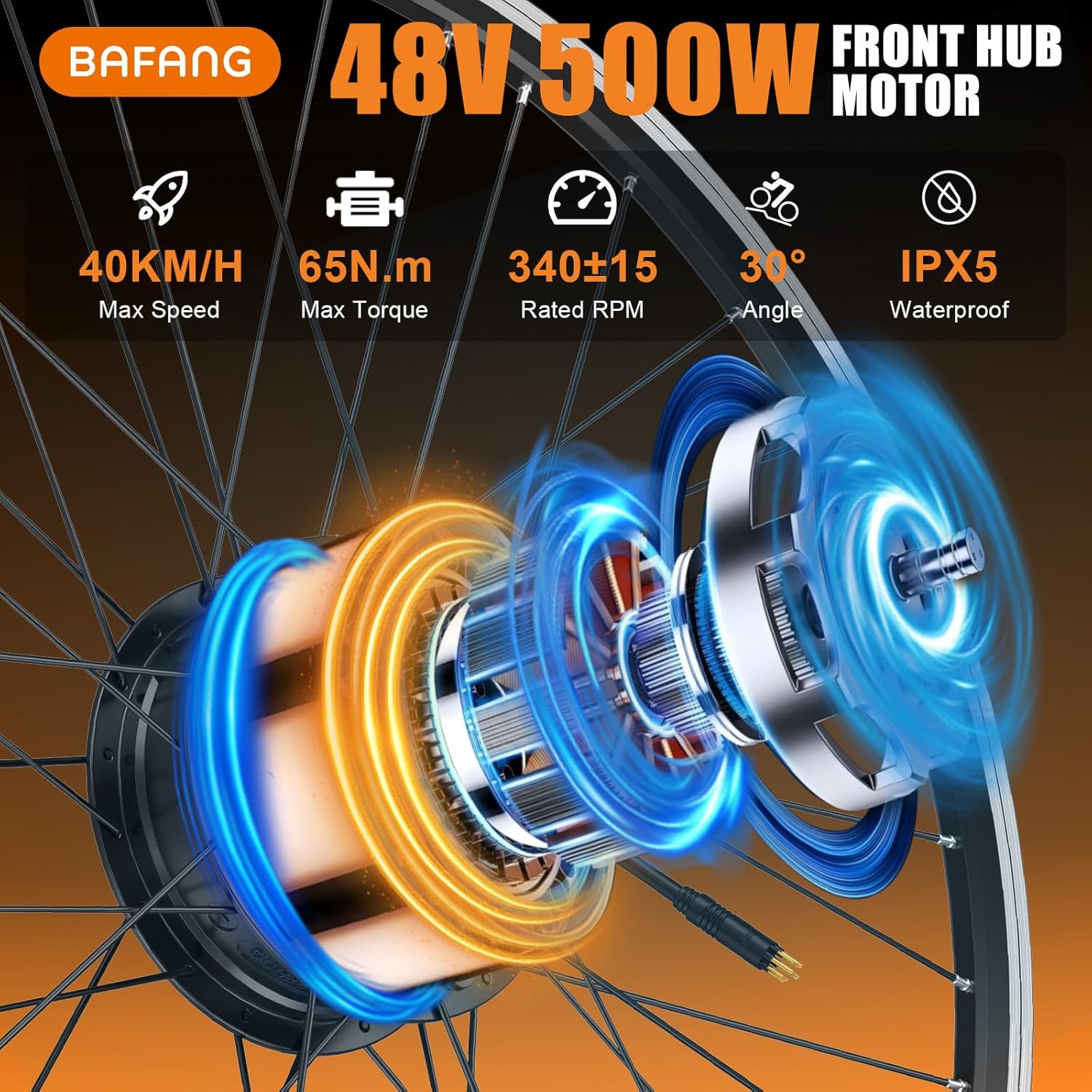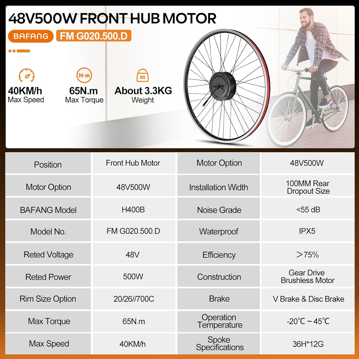 Experience dynamic acceleration and confident hill-climbing with the Bafang 48V 500W front hub motor. Delivering a strong 65N.m torque and speeds up to 40 km/h, this robust motor provides a powerful yet quiet ride, operating at just 55dB. With an IPX5 waterproof rating, it's built for reliable performance in all weather conditions.