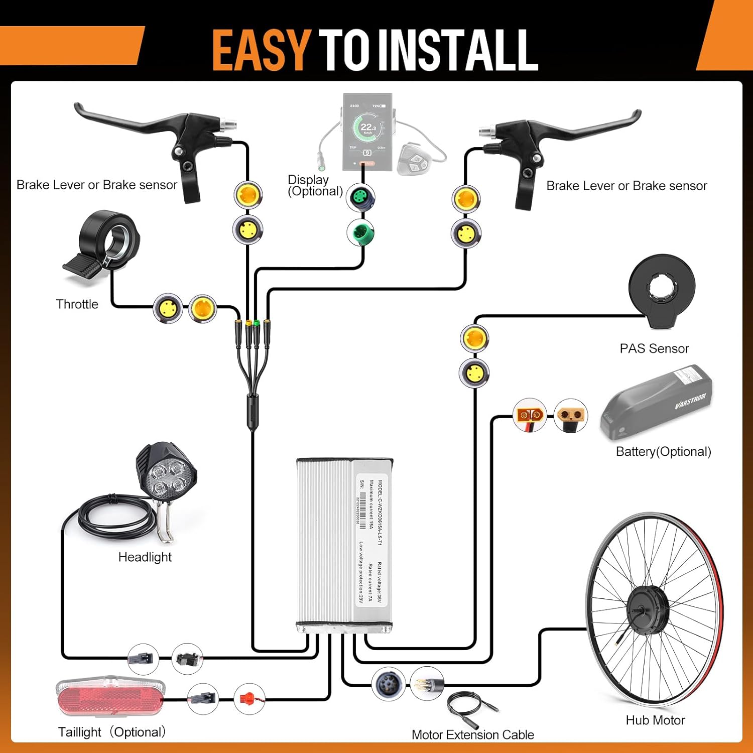 This comprehensive kit includes everything needed for a full front-wheel electric conversion: a pre-laced hub motor wheel, intelligent controller, PAS sensor, thumb throttle, brake levers, and all essential cables and tools. (Note: Battery is optional—select the kit with or without battery as needed.)
