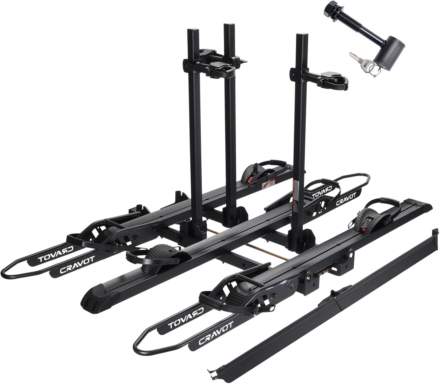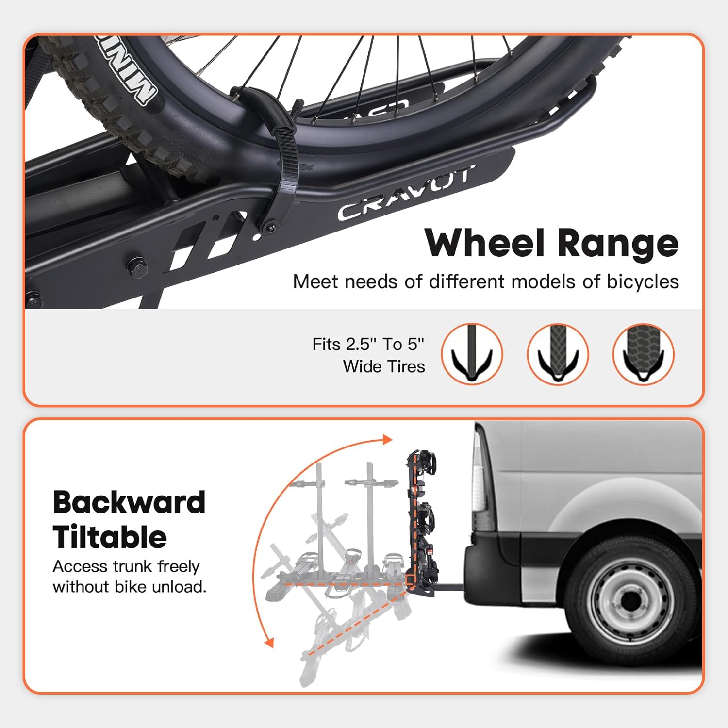The CRAVOT heavy e-bike rack with integrated ramp supports up to 300 lbs in total—or 100 lbs per bike. Designed for vehicles with a standard 2‑inch receiver, this rack easily accommodates electric bikes, mountain bikes, and fat‑tire models with tires up to 5″ wide and wheelbases up to 52 inches.