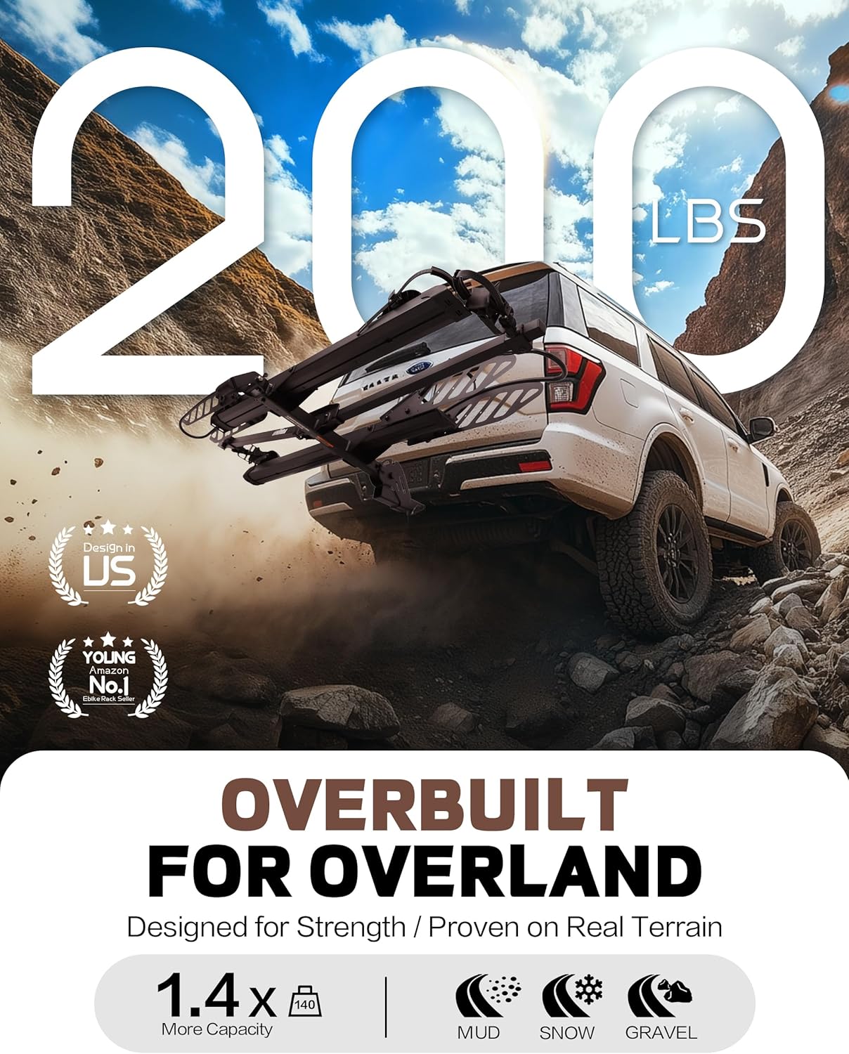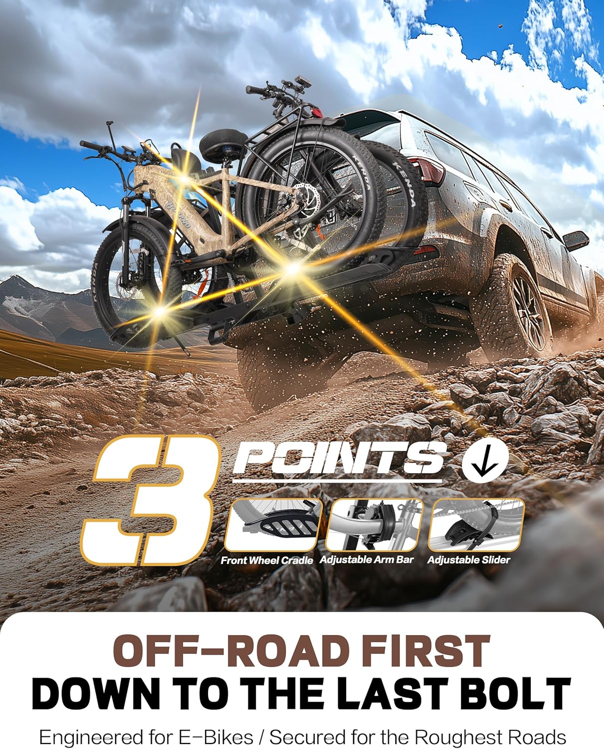 Our 2-inch tow-mounted electric bike rack utilizes a patented V-shape cradle and bolt system for rock-solid transport. Shock-absorbing hitch threads deliver superior stability, while upgraded semi-enclosed connection blocks on support bars provide a stronger, more secure grip on e-bikes.