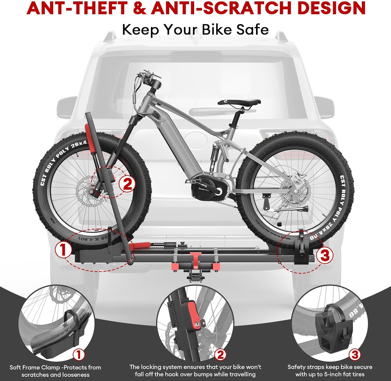 Engineered for maximum security, our heavy-duty e-bike hitch rack features a dual-locking system. It includes a reinforced trailer hitch lock and dual-arm cradles that firmly lock in place. This comprehensive anti-theft design ensures both the rack and your electric bikes remain securely attached to your vehicle, preventing unauthorized removal or movement during transport or storage.