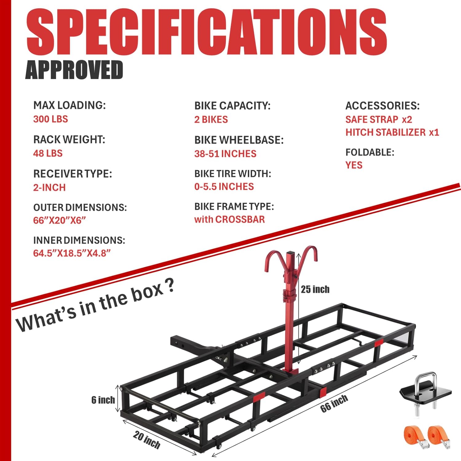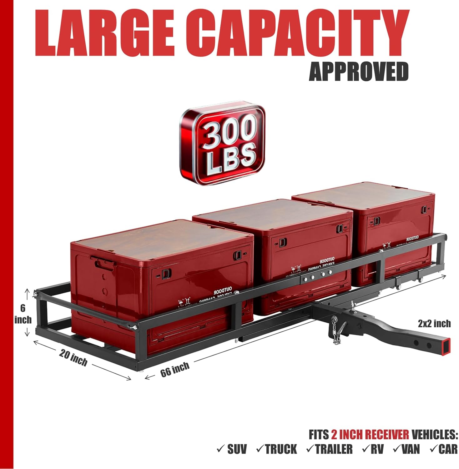 Ideal for road trips and outdoor expeditions. In cargo mode, this hitch rack expands your vehicle's storage capacity. Measuring 66 x 20 x 6 inches, it delivers ample space and heavy-duty load-bearing performance—hauls camping gear, travel essentials, and more, up to 300 lbs.