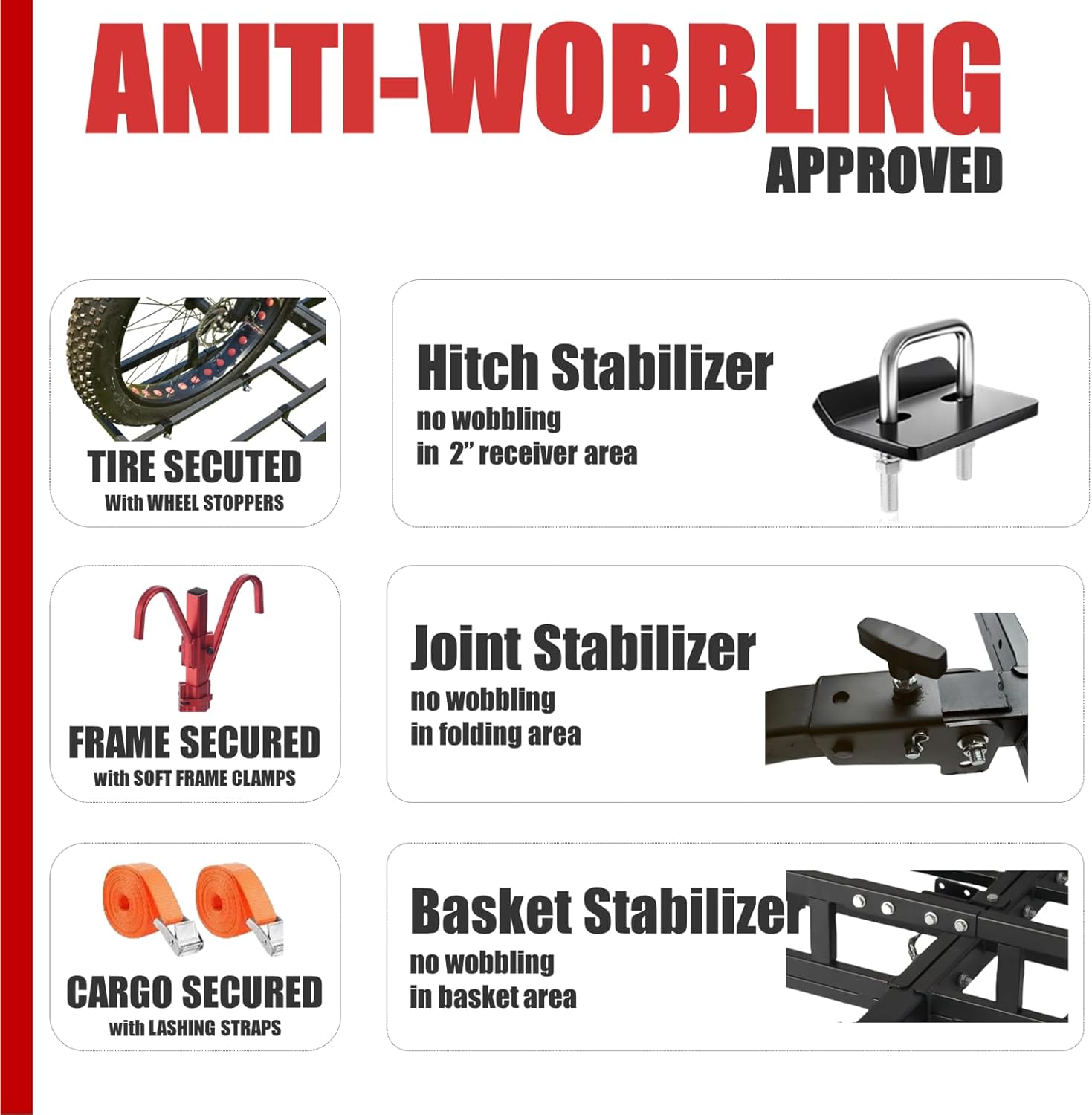 Soft frame clamps, two heavy-duty lashing straps, and integrated wheel stoppers keep your bikes secure during transit. Three anti-rattle stabilizers eliminate wobble and bouncing—even on rough roads.
